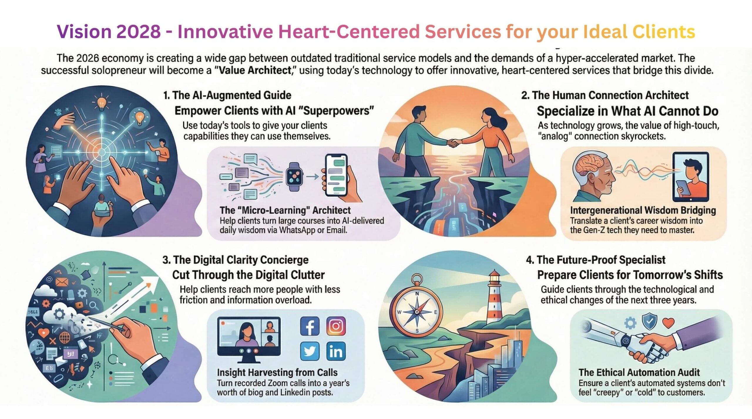 [Download] The Value Architect’s Playbook: This is your detailed roadmap containing 28 innovative service models you can start building today. It breaks down exactly how to package your wisdom for the 2028 economy.